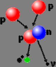 Illustration einer Kernfusion, bei dem zwei Protonen zu einem Deuteriumkern aus einem Proton und einem Neutron reagieren. Ein Positron (e + ) – das Antiteilchen des Elektrons – und ein Elektron-Neutrino entstehen bei der Reaktion.
