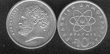 Kursmünze aus Griechenland mit Demokrit und Atomdarstellung