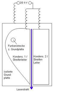 Zu hohe Induktivitäten zwischen Funkenentladung und Streifenleiter werden vermieden, indem die Funkenstrecke direkt im Streifenleiter untergebracht ist (im Bild als Ring dargestellt).