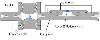 Die Funkenstrecke wird mit einer separaten Hochspannungsquelle innerhalb 0,1...10 s (je nach Leistung) gemeinsam mit der Streifenleiterstruktur gespeist, um sich dann innerhalb 1 ns durch Spontanzündung der Funkenstrecke zu entladen. Die Elektroden der Stickstoffentladung erhalten nur während dieses kurzen Pulses die zur Entladung führende Spannung - nur dadurch können die Ionen der Stickstoffentladung die zum Lasern nötige Inversion erreichen, denn das obere Laserniveau entleert sich sehr schnell. Auch wird die Entladung dadurch homogener - sie hat keine Zeit, sich zu einzelnen Kanälen einzuschnüren.
