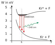 Schematische Darstellung des Elektronenübergangs bei einem KrF-Laser vom angeregtem in den stabilen Zustand