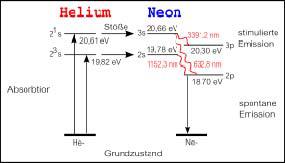 Die Zustände 2 1 s und 2 3 s des Heliums sind metastabil, d.h. es existieren keine optischen Übergänge in energieärmere Zustände. Die Emission von Photonen im Neon-Atom erfolgt durch stimulierte Emission; die Rückkehr in den Grundzustand durch spontane Emission und Rekombinationen an der Kapillarwand.