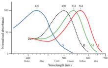 Empfindlichkeitsverteilung der drei Zapfenarten beim Menschen. Schwarz gezeichnet ist die Empfindlichkeit der Stäbchen. Andere Primaten haben abweichende Empfindlichkeitsverteilungen.