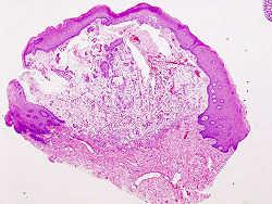 Histopathologic image of extravasation type mucocele of the lower lip. H & E stain.
