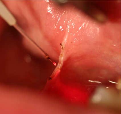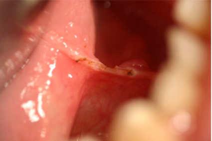 « Previous Page Table of Contents Next Page »A tongue ribbon excision becomes executed. The ribbon tension the teeth 3.1 and 4.1 and create parodontological problems.