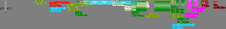 Wavelengths of commercially available lasers. Laser types with distinct laser lines are shown above the wavelength bar, while below are shown lasers that can emit in a wavelength range. The color codifies the type of laser material.