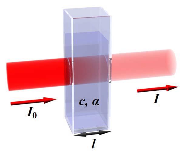 Diagram of Beer-Lambert Law of transmittance of a beam of light as it travels through a cuvette of width
