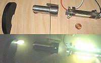 Military surplus Nd:YAG laser rangefinder firing. The laser fires through a collimator, focusing the beam, which blasts a hole through a rubber block, releasing a burst of plasma.